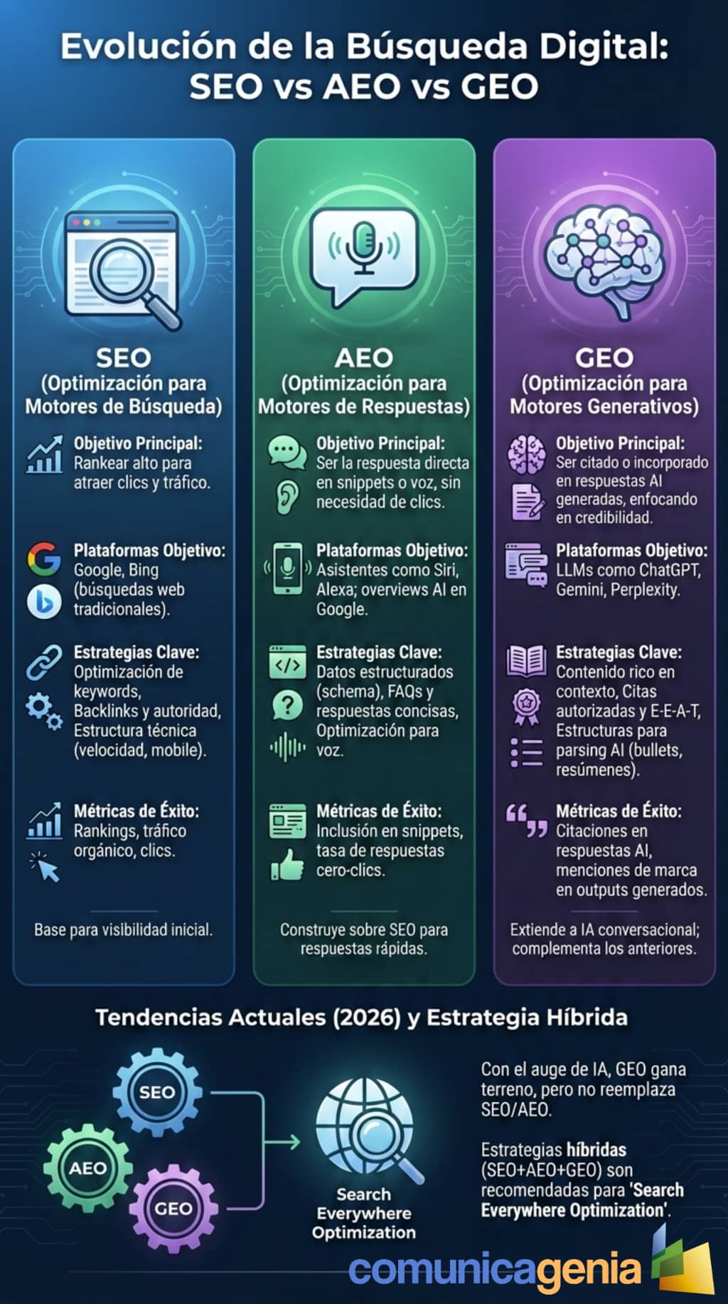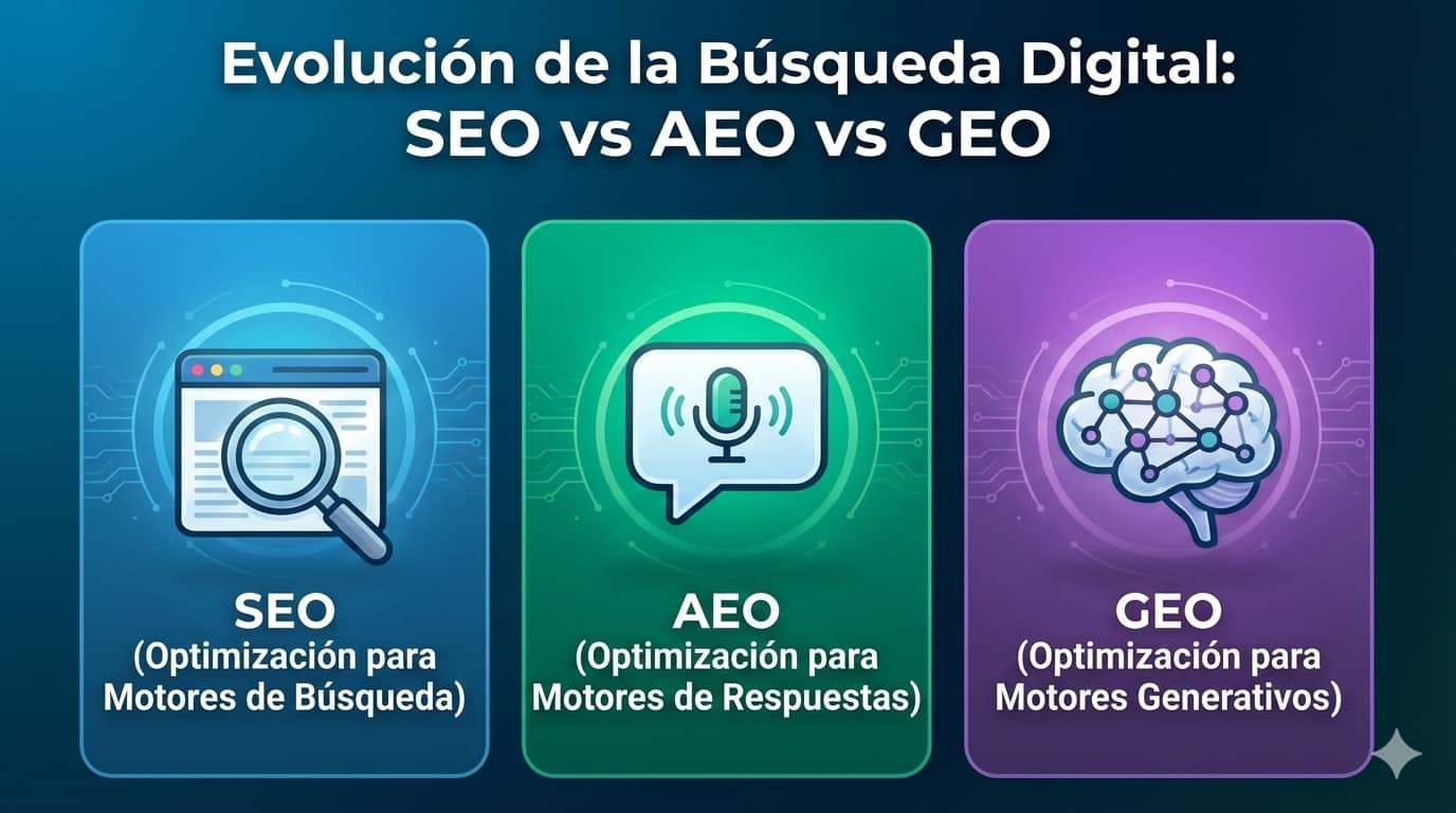 Esta evolución ha transformado las reglas del juego para marcas y creadores, dando paso a un ecosistema donde conviven el SEO, el AEO y el GEO.